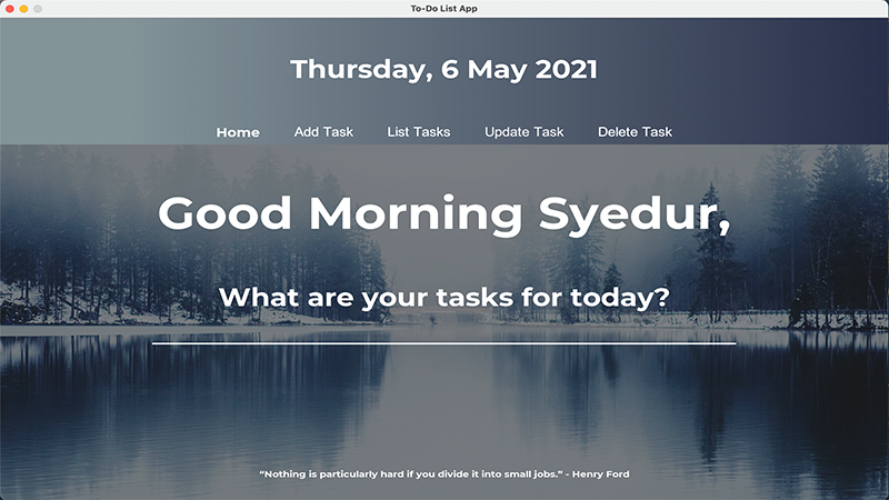 and upcoming deadlines. The app is connected to a backend SQLite database, allowing the user to persistently view their To-Do tasks,